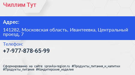 Чиллим Тут по адресу 141282, Московская область, Ивантеевка, Центральный проезд, 7 в дальнейшем Организация, размещена в следующих категориях: