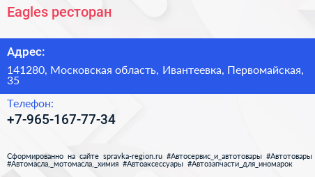 Eagles, ресторан по адресу 141280, Московская область, Ивантеевка, Первомайская, 35 в дальнейшем Организация, размещена в следующих категориях: