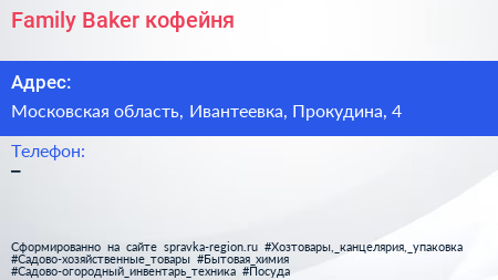 Family Baker, кофейня по адресу Московская область, Ивантеевка, Прокудина, 4 в дальнейшем Организация, размещена в следующих категориях: