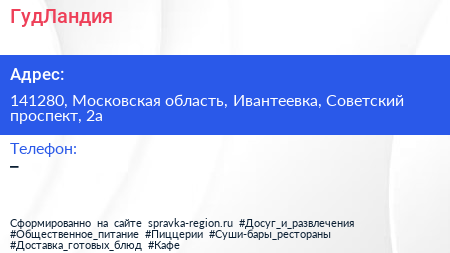 ГудЛандия по адресу 141280, Московская область, Ивантеевка, Советский проспект, 2а в дальнейшем Организация, размещена в следующих категориях: