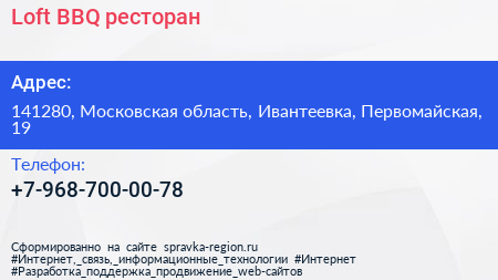 Loft BBQ, ресторан по адресу 141280, Московская область, Ивантеевка, Первомайская, 19 в дальнейшем Организация, размещена в следующих категориях: