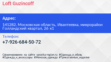 Loft Guzincoff по адресу 141282, Московская область, Ивантеевка, микрорайон Голландский квартал, 26 к1 в дальнейшем Организация, размещена в следующих категориях: