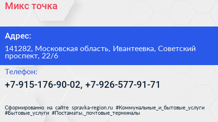 Микс точка по адресу 141282, Московская область, Ивантеевка, Советский проспект, 22/6 в дальнейшем Организация, размещена в следующих категориях: