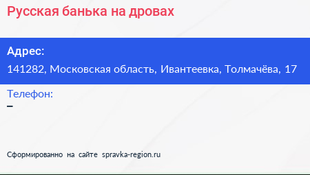 Русская банька на дровах по адресу 141282, Московская область, Ивантеевка, Толмачёва, 17 в дальнейшем Организация, размещена в следующих категориях:
