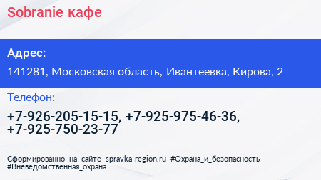 Sobranie, кафе по адресу 141281, Московская область, Ивантеевка, Кирова, 2 в дальнейшем Организация, размещена в следующих категориях: