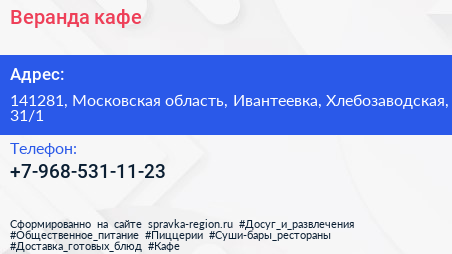Веранда, кафе по адресу 141281, Московская область, Ивантеевка, Хлебозаводская, 31/1 в дальнейшем Организация, размещена в следующих категориях: