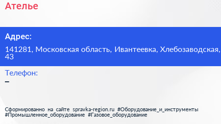 Ателье по адресу 141281, Московская область, Ивантеевка, Хлебозаводская, 43 в дальнейшем Организация, размещена в следующих категориях:
