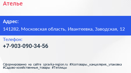 Ателье по адресу 141282, Московская область, Ивантеевка, Заводская, 12 в дальнейшем Организация, размещена в следующих категориях: