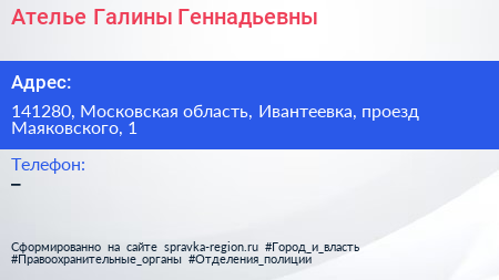 Ателье Галины Геннадьевны по адресу 141280, Московская область, Ивантеевка, проезд Маяковского, 1 в дальнейшем Организация, размещена в следующих категориях: