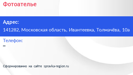 Фотоателье по адресу 141282, Московская область, Ивантеевка, Толмачёва, 10а в дальнейшем Организация, размещена в следующих категориях: