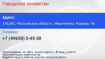 Городское хозяйство по адресу 141281, Московская область, Ивантеевка, Кирова, 56 в дальнейшем Организация, размещена в следующих категориях: