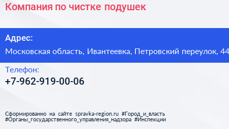 Компания по чистке подушек по адресу Московская область, Ивантеевка, Петровский переулок, 44 в дальнейшем Организация, размещена в следующих категориях: