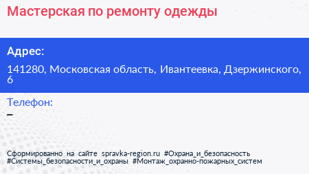Мастерская по ремонту одежды по адресу 141280, Московская область, Ивантеевка, Дзержинского, 6 в дальнейшем Организация, размещена в следующих категориях: