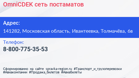 OmniCDEK, сеть постаматов по адресу 141282, Московская область, Ивантеевка, Толмачёва, 6в в дальнейшем Организация, размещена в следующих категориях: