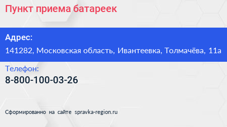 Пункт приема батареек по адресу 141282, Московская область, Ивантеевка, Толмачёва, 11а в дальнейшем Организация, размещена в следующих категориях: