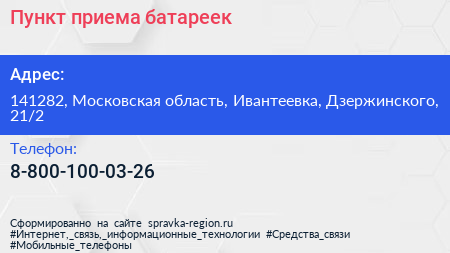 Пункт приема батареек по адресу 141282, Московская область, Ивантеевка, Дзержинского, 21/2 в дальнейшем Организация, размещена в следующих категориях: