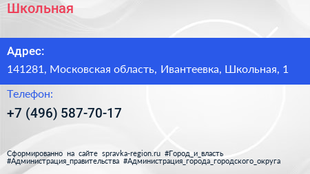 Школьная по адресу 141281, Московская область, Ивантеевка, Школьная, 1 в дальнейшем Организация, размещена в следующих категориях: