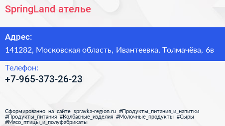 SpringLand, ателье по адресу 141282, Московская область, Ивантеевка, Толмачёва, 6в в дальнейшем Организация, размещена в следующих категориях: