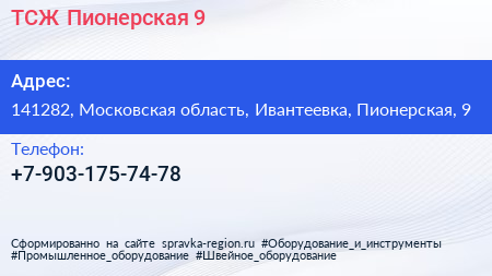 ТСЖ Пионерская-9 по адресу 141282, Московская область, Ивантеевка, Пионерская, 9 в дальнейшем Организация, размещена в следующих категориях: