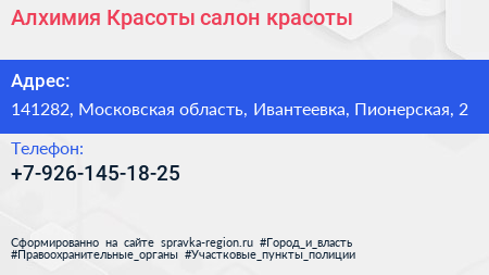 Алхимия Красоты, салон красоты по адресу 141282, Московская область, Ивантеевка, Пионерская, 2 в дальнейшем Организация, размещена в следующих категориях: