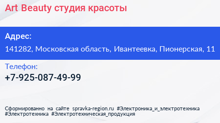 Art Beauty, студия красоты по адресу 141282, Московская область, Ивантеевка, Пионерская, 11 в дальнейшем Организация, размещена в следующих категориях: