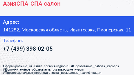АзияСПА, СПА-салон по адресу 141282, Московская область, Ивантеевка, Пионерская, 11 в дальнейшем Организация, размещена в следующих категориях: