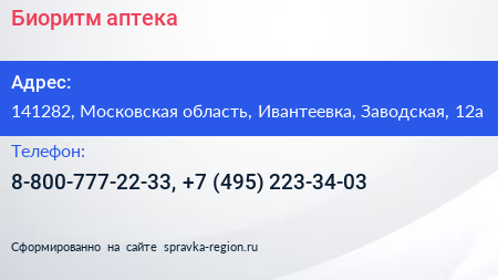 Биоритм, аптека по адресу 141282, Московская область, Ивантеевка, Заводская, 12а в дальнейшем Организация, размещена в следующих категориях: