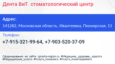 Дента ВиТ+, стоматологический центр по адресу 141282, Московская область, Ивантеевка, Пионерская, 11 в дальнейшем Организация, размещена в следующих категориях: