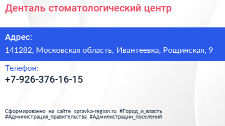 Денталь, стоматологический центр по адресу 141282, Московская область, Ивантеевка, Рощинская, 9 в дальнейшем Организация, размещена в следующих категориях:
