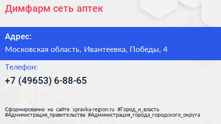 Димфарм, сеть аптек по адресу Московская область, Ивантеевка, Победы, 4 в дальнейшем Организация, размещена в следующих категориях:
