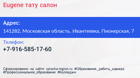 Eugene, тату-салон по адресу 141282, Московская область, Ивантеевка, Пионерская, 7 в дальнейшем Организация, размещена в следующих категориях: