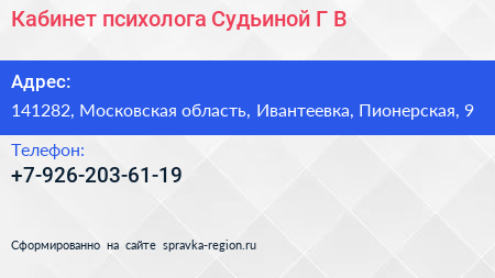 Кабинет психолога Судьиной Г.В. по адресу 141282, Московская область, Ивантеевка, Пионерская, 9 в дальнейшем Организация, размещена в следующих категориях: