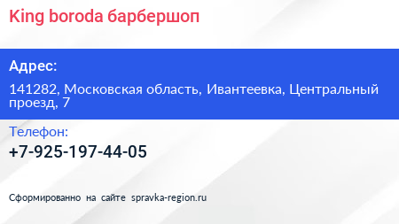 King boroda, барбершоп по адресу 141282, Московская область, Ивантеевка, Центральный проезд, 7 в дальнейшем Организация, размещена в следующих категориях: