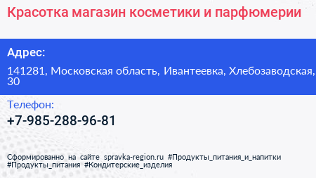 Красотка, магазин косметики и парфюмерии по адресу 141281, Московская область, Ивантеевка, Хлебозаводская, 30 в дальнейшем Организация, размещена в следующих категориях: