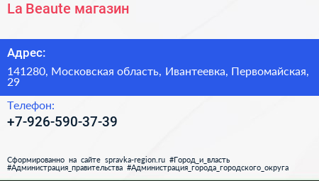 La Beaute, магазин по адресу 141280, Московская область, Ивантеевка, Первомайская, 29 в дальнейшем Организация, размещена в следующих категориях: