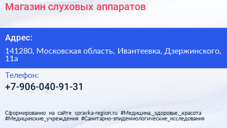 Магазин слуховых аппаратов по адресу 141280, Московская область, Ивантеевка, Дзержинского, 11а в дальнейшем Организация, размещена в следующих категориях: