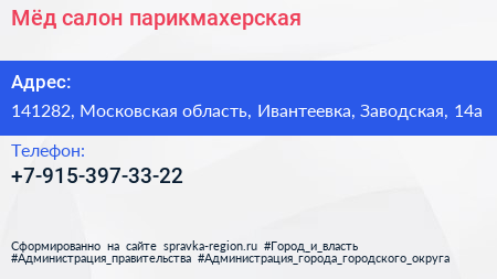 Мёд, салон-парикмахерская по адресу 141282, Московская область, Ивантеевка, Заводская, 14а в дальнейшем Организация, размещена в следующих категориях: