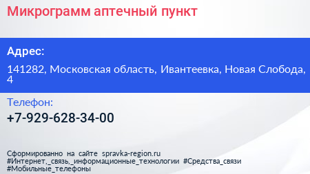 Микрограмм, аптечный пункт по адресу 141282, Московская область, Ивантеевка, Новая Слобода, 4 в дальнейшем Организация, размещена в следующих категориях: