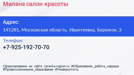 Милана, салон красоты по адресу 141281, Московская область, Ивантеевка, Бережок, 3 в дальнейшем Организация, размещена в следующих категориях: