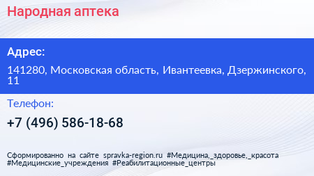Народная аптека по адресу 141280, Московская область, Ивантеевка, Дзержинского, 11 в дальнейшем Организация, размещена в следующих категориях: