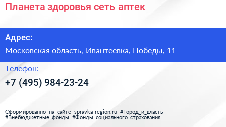 Планета здоровья, сеть аптек по адресу Московская область, Ивантеевка, Победы, 11 в дальнейшем Организация, размещена в следующих категориях: