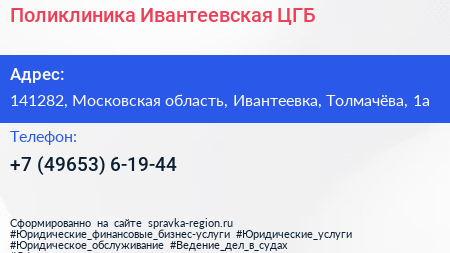 Поликлиника, Ивантеевская ЦГБ по адресу 141282, Московская область, Ивантеевка, Толмачёва, 1а в дальнейшем Организация, размещена в следующих категориях: