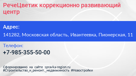 РечеЦветик, коррекционно-развивающий центр по адресу 141282, Московская область, Ивантеевка, Пионерская, 11 в дальнейшем Организация, размещена в следующих категориях: