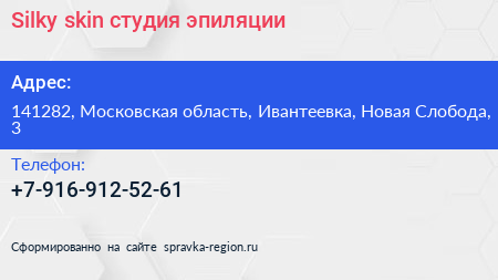 Silky skin, студия эпиляции по адресу 141282, Московская область, Ивантеевка, Новая Слобода, 3 в дальнейшем Организация, размещена в следующих категориях: