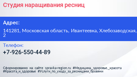 Студия наращивания ресниц по адресу 141281, Московская область, Ивантеевка, Хлебозаводская, 2 в дальнейшем Организация, размещена в следующих категориях: