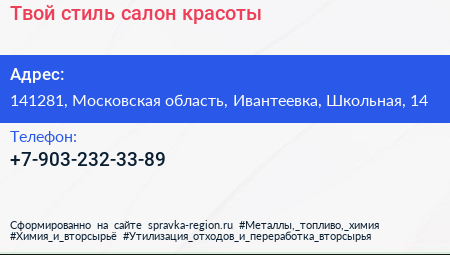 Твой стиль, салон красоты по адресу 141281, Московская область, Ивантеевка, Школьная, 14 в дальнейшем Организация, размещена в следующих категориях: