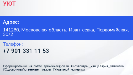 УЮТ по адресу 141280, Московская область, Ивантеевка, Первомайская, 30/2 в дальнейшем Организация, размещена в следующих категориях: