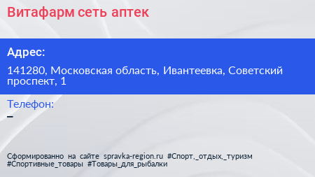 Витафарм, сеть аптек по адресу 141280, Московская область, Ивантеевка, Советский проспект, 1 в дальнейшем Организация, размещена в следующих категориях: