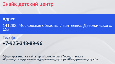 Знайк, детский центр по адресу 141282, Московская область, Ивантеевка, Дзержинского, 15а в дальнейшем Организация, размещена в следующих категориях: