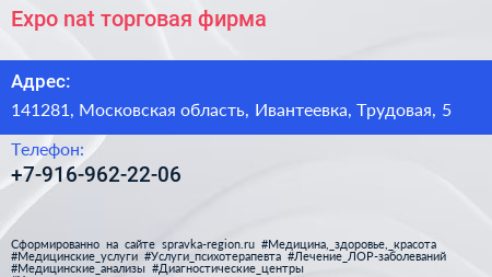 Expo-nat, торговая фирма по адресу 141281, Московская область, Ивантеевка, Трудовая, 5 в дальнейшем Организация, размещена в следующих категориях:
